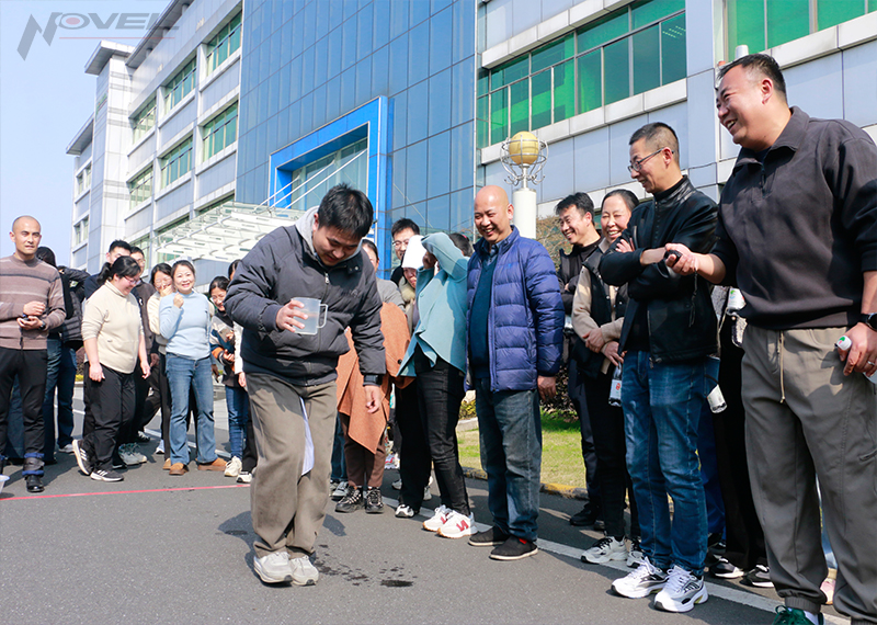 “夾紙運杯”要求參賽者手持一次性杯子一只刻度杯(杯中裝有規定數量的水),膝蓋夾A4紙,走到設定的終點,將杯子和紙移交給下一位繼續往返運送,全隊10人完成用時最短,杯中水保存最完好的組獲勝。與以往不同的是,本次“夾紙運杯”還增加了“男同胞”組共同參賽,在場男職工在參與競技的同時,也體會到女性日常工作更需要細致開展的細心與耐心。